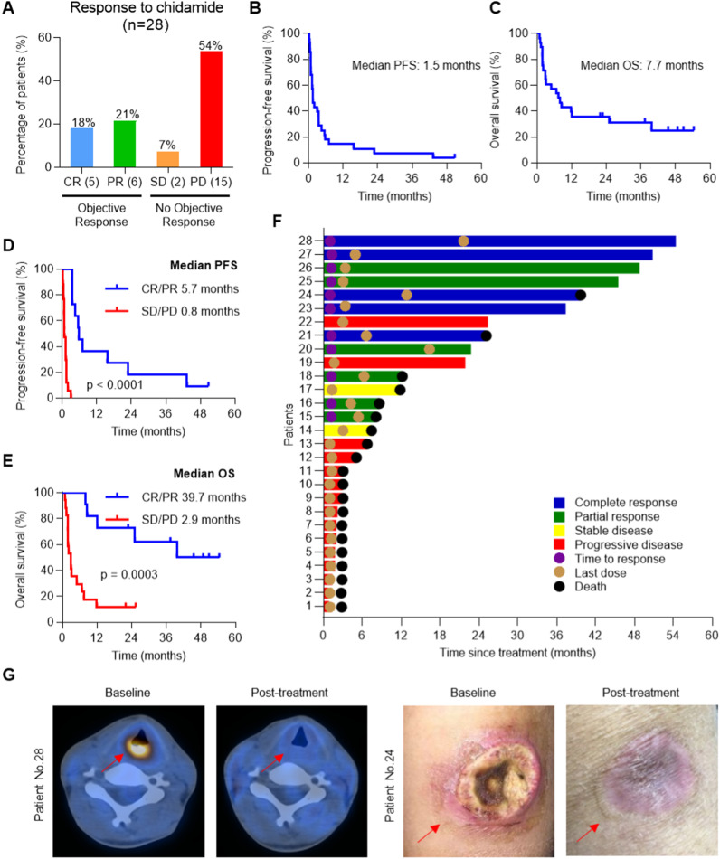Methods: We performed a phase II clinical trial to evaluate the efficacy of chidamide in 28 relapsed/refractory NKTL patients. Integrative transcriptomic, chromatin profiling analysis and functional studies were performed to identify potential predictive biomarkers and unravel the mechanisms of resistance to chidamide. Immunohistochemistry (IHC) was used to validate the predictive biomarkers in tumors from the clinical trial.