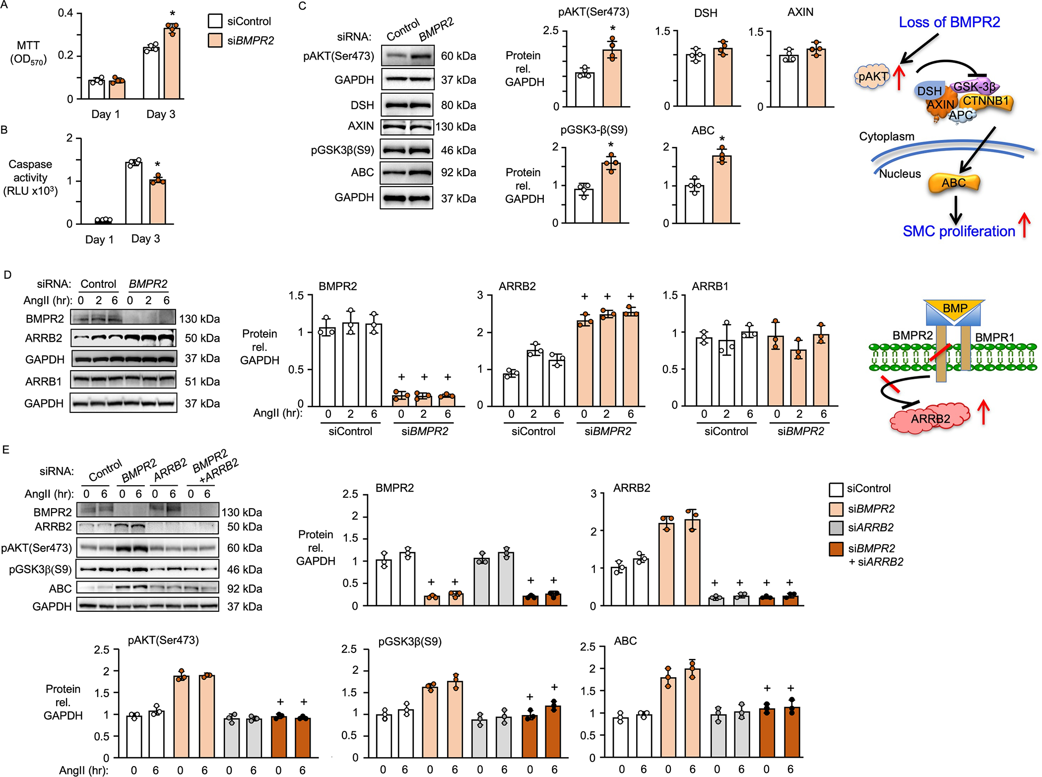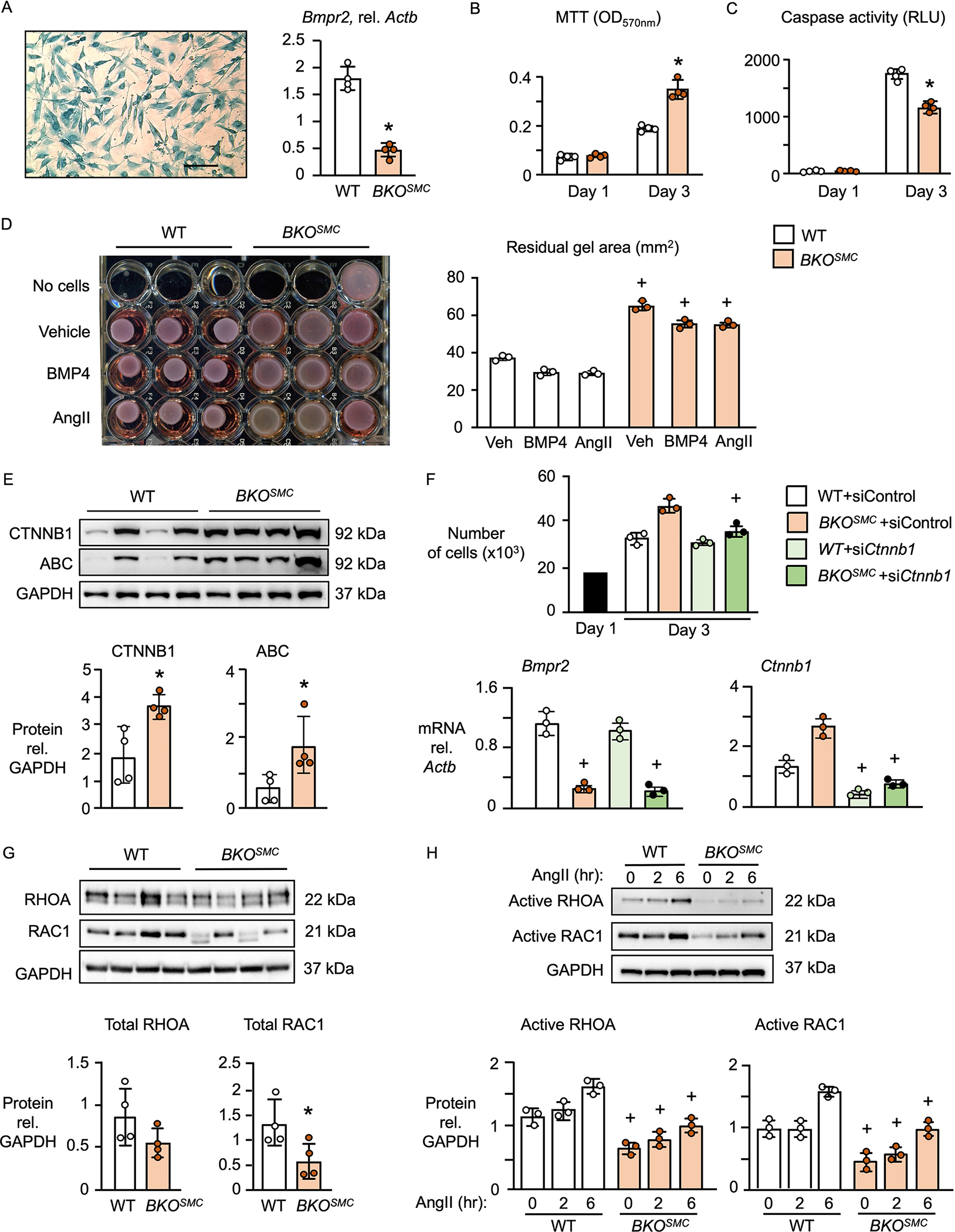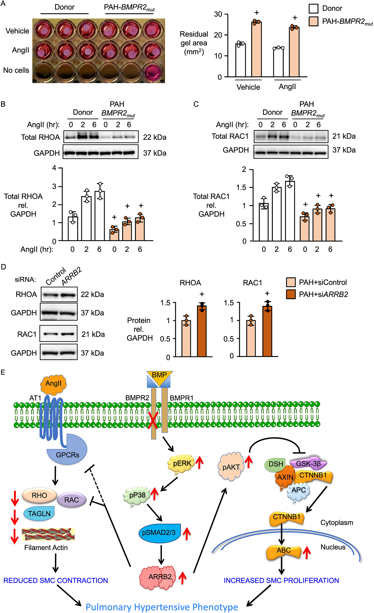 Results: BKOSMC mice showed reduced hypoxia-induced vasoconstriction and persistent pulmonary hypertension following recovery from hypoxia, associated with sustained muscularization of distal pulmonary arteries. PASMC from mutant compared to control mice displayed reduced contractility at baseline and in response to angiotensin II, increased proliferation and apoptosis resistance. Human PASMC with reduced BMPR2 by small interference RNA, and PASMC from PAH patients with a BMPR2 mutation showed a similar phenotype related to upregulation of pERK1/2 (phosphorylated extracellular signal related kinase 1/2)-pP38-pSMAD2/3 mediating elevation in ARRB2 (β-arrestin2), pAKT (phosphorylated protein kinase B) inactivation of GSK3-beta, CTNNB1 (β-catenin) nuclear translocation and reduction in RHOA (Ras homolog family member A) and RAC1 (Ras-related C3 botulinum toxin substrate 1). Decreasing ARRB2 in PASMC with reduced BMPR2 restored normal signaling, reversed impaired contractility and attenuated heightened proliferation and in mice with inducible loss of BMPR2 in SMC, decreasing ARRB2 prevented persistent pulmonary hypertension.