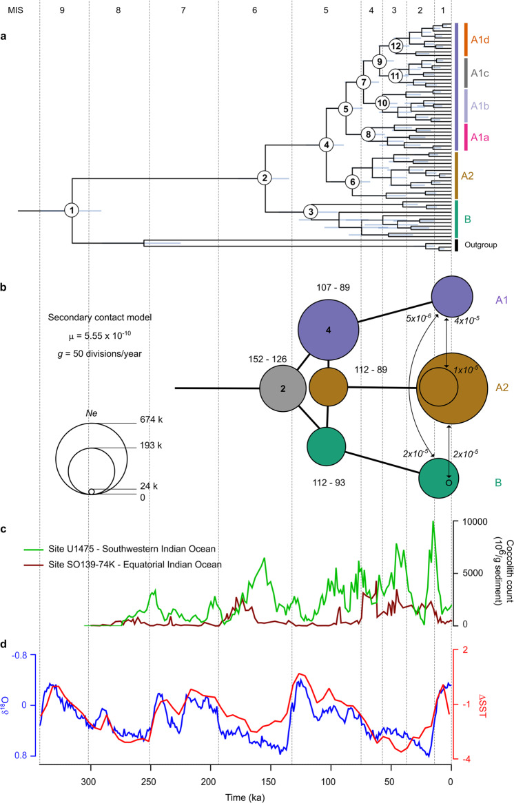 Marine phytoplankton play important roles in the global ecosystem, with a limited number of cosmopolitan keystone species driving their biomass. Recent studies have revealed that many of these phytoplankton are complexes composed of sibling species, but little is known about the evolutionary processes underlying their formation. Gephyrocapsa huxleyi, a widely distributed and abundant unicellular marine planktonic algae, produces calcified scales (coccoliths), thereby significantly affects global biogeochemical cycles via sequestration of inorganic carbon. This species is composed of morphotypes defined by differing degrees of coccolith calcification, the evolutionary ecology of which remains unclear. Here, we report an integrated morphological, ecological and genomic survey across globally distributed G. huxleyi strains to reconstruct evolutionary relationships between morphotypes in relation to their habitats. While G. huxleyi has been considered a single cosmopolitan species, our analyses demonstrate that it has evolved to comprise at least three distinct species, which led us to formally revise the taxonomy of the G. huxleyi complex. Moreover, the first speciation event occurred before the onset of the last interglacial period (~140 ka), while the second followed during this interglacial. Then, further rapid diversifications occurred during the most recent ice-sheet expansion of the last glacial period and established morphotypes as dominant populations across environmental clines. These results suggest that glacial-cycle dynamics contributed to the isolation of ocean basins and the segregations of oceans fronts as extrinsic drivers of micro-evolutionary radiations in extant marine phytoplankton.