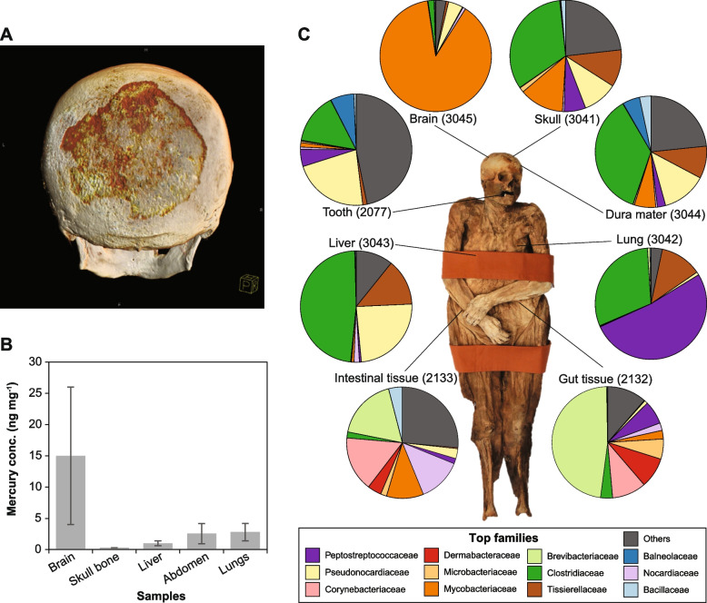 Results: Although we could not detect any molecular signs of the syphilis-causing pathogen Treponema pallidum subsp. pallidum, we realized high prevalence of a nontuberculous mycobacterium (NTM) species in brain tissue sample. The genome analysis of this NTM displayed richness of virulence genes and toxins, and similarity to other infectious NTM, known to infect immunocompromised patients. In addition, it displayed potential resistance to mercury compounds, which might indicate a selective advantage against the applied treatment. This suggests that ACB might have suffered from an atypical mycobacteriosis during her life, which could explain the mummy's bone lesion and high mercury concentrations.