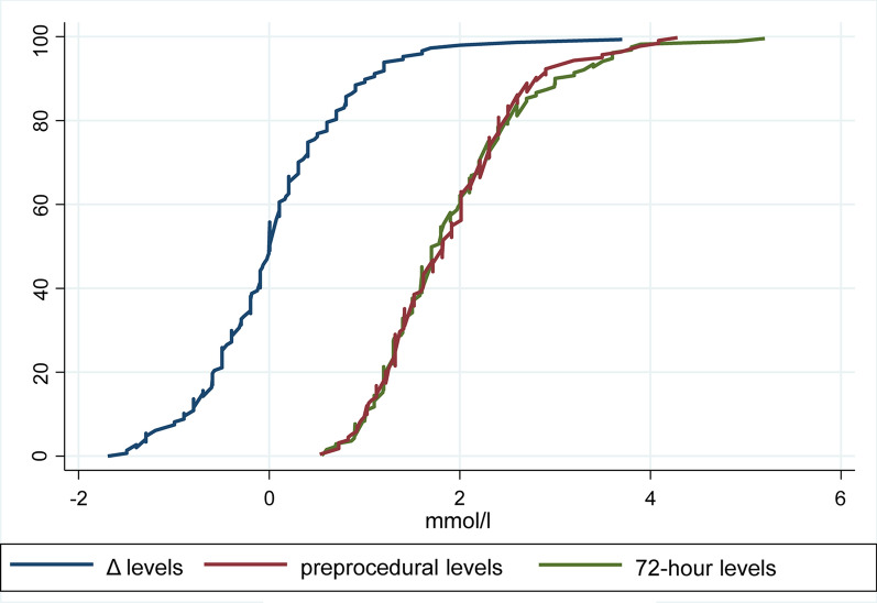 Results: 142 diabetic patients on metformin therapy were included. Median preprocedural lactate level was 1.8 mmol/l [interquartile range (IQR) 1.3-2.3]. Lactate levels at 72 h after coronary angiography were 1.7 mmol/l (IQR 1.3-2.3), with no significant differences as compared to preprocedural levels (p = 0.91; median difference = 0; IQR - 0.5 to 0.4 mmol/l). One patient had 72-h levels ≥ 5 mmol/l (5.3 mmol/l), but no cases of M-ALA were reported. CA-AKI occurred in 9 patients (6.1%) and median serum creatinine and estimated glomerular filtration rate remained similar throughout the periprocedural period. At a median follow-up of 90 days (43-150), no patients required hemodialysis and 2 patients died due to non-cardiac causes.