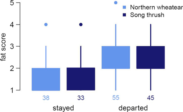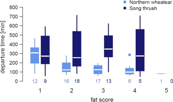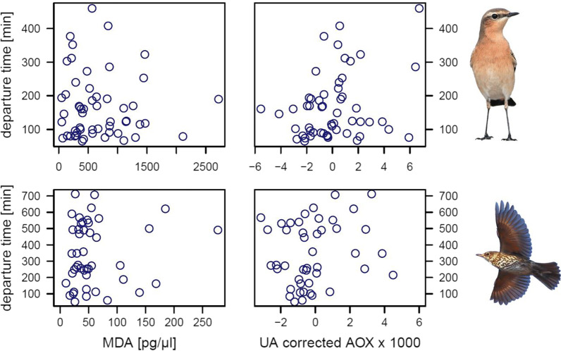 Results: The decision to resume migration was not related with MDA concentration in either study species, also not when this was corrected for circulating fatty acid concentrations. Similarly, AOX did not affect this decision, also not when corrected for uric-acid concentration. The time within the night when birds departed also was not affected by MDA concentration or AOX. However, confirming earlier observations, we found that in both species, fat individuals were more likely to depart than lean individuals, and fat northern wheatears departed earlier within the night than lean conspecifics. Northern wheatears additionally departed earlier in spring with more southerly winds.