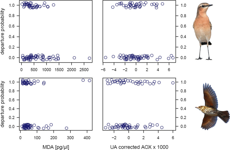 Methods: To test this hypothesis, we measured parameters of the oxidative balance and related these to stopover departure decisions of song thrushes (Turdus philomelos) and northern wheatears (Oenanthe oenanthe), a medium- and long-distance songbird migrant, respectively. We measured malondialdehyde (MDA) concentration, a biomarker for oxidative lipid damage, and total non-enzymatic antioxidant capacity (AOX), an overall biomarker of protection against ROS. Stopover departure decisions were determined using a fully automated telemetry system set-up on our small island study site.