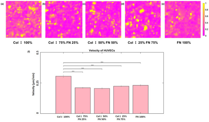 ECM composition is important in a host of pathophysiological processes such as angiogenesis, atherosclerosis, and diabetes, for example and during each of these processes ECM composition has been reported to change over time. However, the impact ECM composition has on the endothelium’s ability to respond mechanically is currently unknown. Therefore, in this study we seeded human umbilical vein endothelial cells (HUVECs) onto soft hydrogels coated with an ECM concentration of 0.1 mg/mL at the following collagen I (Col-I) and fibronectin (FN) ratios: 100%Col-I, 75%Col-I-25%FN, 50%Col-I-50%FN, 25%Col-I-75%FN, and 100%FN. We subsequently measured tractions, intercellular stresses, strain energy, cell morphology, and cell velocity. Our results revealed huvecs seeded on gels coated with 50% Col-I - 50% FN to have the highest intercellular stresses, tractions, strain energies, but the lowest velocities and cell circularity. Huvecs seeded on 100% Col-I had the lowest tractions, cell area while havingthe highest velocities and cell circularity. In addition, cells cultured on 25% Col-I and 75% FN had the lowest intercellular stresses, but the highest cell area. Huvecs cultured on 100% FN yielded the lowest strain energies. We believe these results will be of great importance to the cardiovascular field, biomedical field, and cell mechanics. Summary: Study the influence of different Col-I - FN ECM compositions on endothelial cell mechanics and morphology.