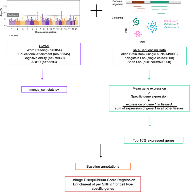 Neuroimaging studies implicate multiple cortical regions in reading ability/disability. However, the neural cell types integral to the reading process are unknown. To contribute to this gap in knowledge, we integrated genetic results from genome-wide association studies for word reading (n = 5054) with gene expression datasets from adult/fetal human brain. Linkage disequilibrium score regression (LDSC) suggested that variants associated with word reading were enriched in genes expressed in adult excitatory neurons, specifically layer 5 and 6 FEZF2 expressing neurons and intratelencephalic (IT) neurons, which express the marker genes LINC00507, THEMIS, or RORB. Inhibitory neurons (VIP, SST, and PVALB) were also found. This finding was interesting as neurometabolite studies previously implicated excitatory-inhibitory imbalances in the etiology of reading disabilities (RD). We also tested traits that shared genetic etiology with word reading (previously determined by polygenic risk scores): attention-deficit/hyperactivity disorder (ADHD), educational attainment, and cognitive ability. For ADHD, we identified enrichment in L4 IT adult excitatory neurons. For educational attainment and cognitive ability, we confirmed previous studies identifying multiple subclasses of adult cortical excitatory and inhibitory neurons, as well as astrocytes and oligodendrocytes. For educational attainment and cognitive ability, we also identified enrichment in multiple fetal cortical excitatory and inhibitory neurons, intermediate progenitor cells, and radial glial cells. In summary, this study supports a role of excitatory and inhibitory neurons in reading and excitatory neurons in ADHD and contributes new information on fetal cell types enriched in educational attainment and cognitive ability, thereby improving our understanding of the neurobiological basis of reading/correlated traits.