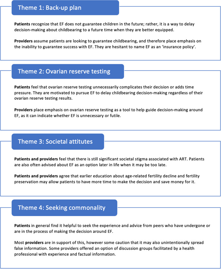 Findings: Four themes were identified and explored, illuminating ways in which patients and providers navigate decision-making around EF: (1) patients viewed EF as a 'back-up plan' for delaying the decision about whether to have children, while providers were hesitant to present EF in this way given the uncertainty of success; (2) providers viewed ovarian reserve testing as essential while patients believed it unnecessarily complicated the decision; (3) patients and providers cited a need for change in broader societal attitudes regarding EF since social stigma was a significant barrier to decision-making; and (4) commonality and peer support were desired by patients to assist in their decision, although some providers were hesitant to recommend this to patients.