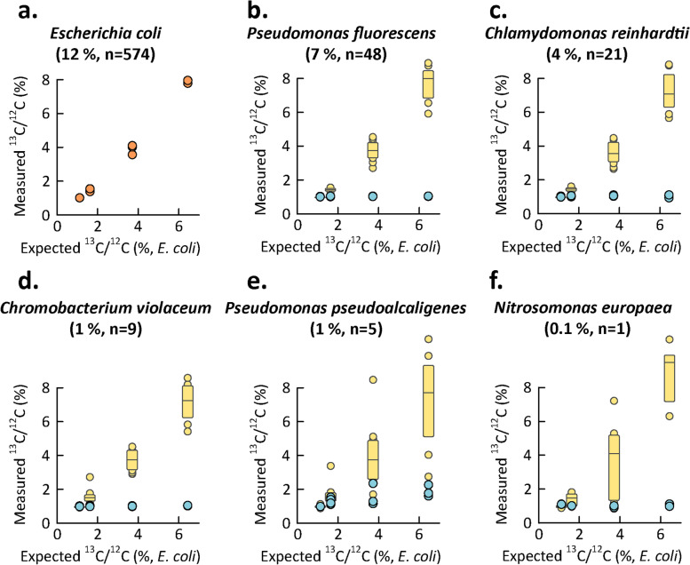 Background: Stable isotope probing (SIP) approaches are a critical tool in microbiome research to determine associations between species and substrates, as well as the activity of species. The application of these approaches ranges from studying microbial communities important for global biogeochemical cycling to host-microbiota interactions in the intestinal tract. Current SIP approaches, such as DNA-SIP or nanoSIMS allow to analyze incorporation of stable isotopes with high coverage of taxa in a community and at the single cell level, respectively, however they are limited in terms of sensitivity, resolution or throughput.