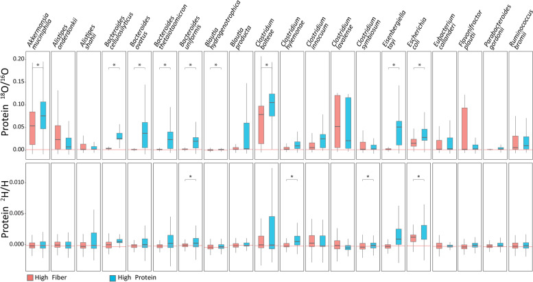 Results: Here, we present an ultra-sensitive, high-throughput protein-based stable isotope probing approach (Protein-SIP), which cuts cost for labeled substrates by 50-99% as compared to other SIP and Protein-SIP approaches and thus enables isotope labeling experiments on much larger scales and with higher replication. The approach allows for the determination of isotope incorporation into microbiome members with species level resolution using standard metaproteomics liquid chromatography-tandem mass spectrometry (LC-MS/MS) measurements. At the core of the approach are new algorithms to analyze the data, which have been implemented in an open-source software ( https://sourceforge.net/projects/calis-p/ ). We demonstrate sensitivity, precision and accuracy using bacterial cultures and mock communities with different labeling schemes. Furthermore, we benchmark our approach against two existing Protein-SIP approaches and show that in the low labeling range used our approach is the most sensitive and accurate. Finally, we measure translational activity using 18O heavy water labeling in a 63-species community derived from human fecal samples grown on media simulating two different diets. Activity could be quantified on average for 27 species per sample, with 9 species showing significantly higher activity on a high protein diet, as compared to a high fiber diet. Surprisingly, among the species with increased activity on high protein were several Bacteroides species known as fiber consumers. Apparently, protein supply is a critical consideration when assessing growth of intestinal microbes on fiber, including fiber-based prebiotics.
