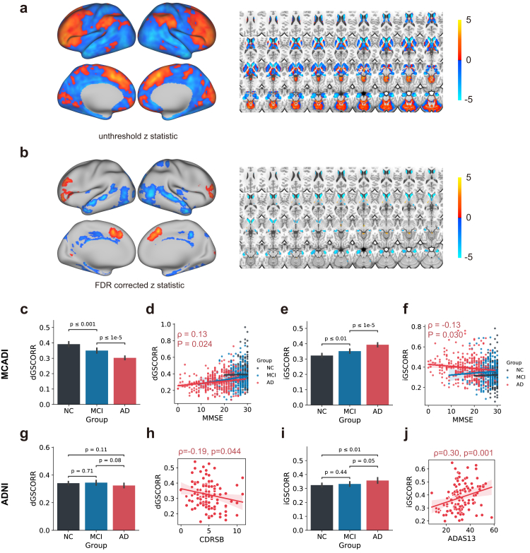 Methods: fMRI scans from a discovery dataset (n = 809) and a validated dataset (n = 542) were used in the analysis. We investigated the alteration of GS topography using the GS correlation (GSCORR) in patients with mild cognitive impairment (MCI) and AD. The association between GS alterations and functional network properties was also investigated based on network theory. The underlying mechanism of GSCORR alterations was elucidated using imaging-transcriptomics.