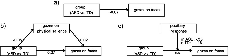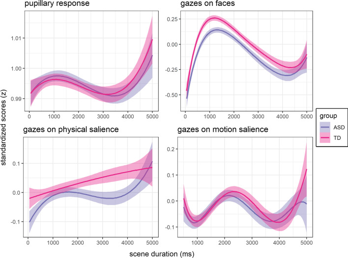 Results: We found no group differences in gazes on salience, whereas pupillary responses were associated with altered gazes on physical and motion salience. In ASD compared to TD, we observed pupillary responses that were higher for non-human scenes and lower for human scenes. In ASD, we observed lower gazes on faces across the duration of the scenes. Crucially, this different social attention was influenced by gazes on physical salience and moderated by pupillary responses.