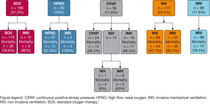 Results: Four hundred ninety-nine patients with COVID-19-associated ARDS (mild, n = 137; moderate, n = 247; and severe, n = 115) were included (ICU admission, 38.9%). Standard oxygen therapy (SOX), high-flow nasal oxygen (HFNO), CPAP, noninvasive ventilation (NIV), and invasive mechanical ventilation (IMV) was used as the first-line (most advanced) respiratory support technique in 37.3% (35.3%), 10% (9.4%), 11.6% (4.8%), 23.4% (14.4%), and 17.6% (36.6%) of patients, respectively. The first-line respiratory support technique was escalated in 19.8% of patients. Twenty-eight-day mortality was 51.9% (mild ARDS, 13.1%; moderate ARDS, 62.3%; severe ARDS, 75.7%; P < .001) and was associated with respiratory support techniques as follows: SOX, 19.9%; HFNO, 31.9%; CPAP, 58.3%; NIV 61.1%; and IMV, 83.9% (P < .001). Proning was used in 79 patients (15.8%; 59 of 79 awake) and was associated with lower mortality (40.5% vs 54%; P = .03). The oxygen saturation to Fio2 ratio (OR, 0.99; 95% CI, 0.98-0.99; P < .001) and respiratory rate (OR, 1.07; 95% CI, 1.03-1.12; P = .002) at admission and NIV (OR, 6.31; 95% CI, 2.29-17.37; P < .001) or IMV (OR, 8.08; 95% CI, 3.52-18.57; P < .001) use were independent risk factors for death.