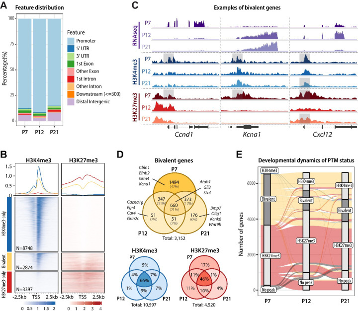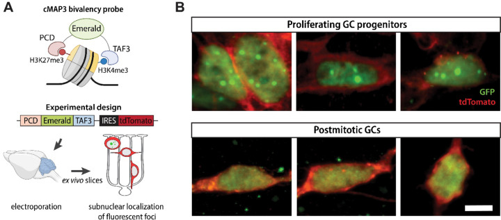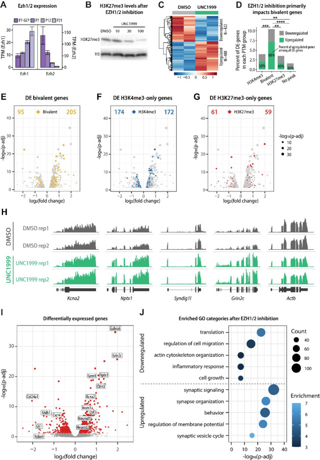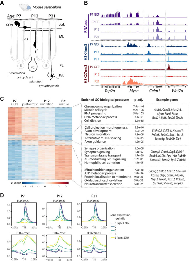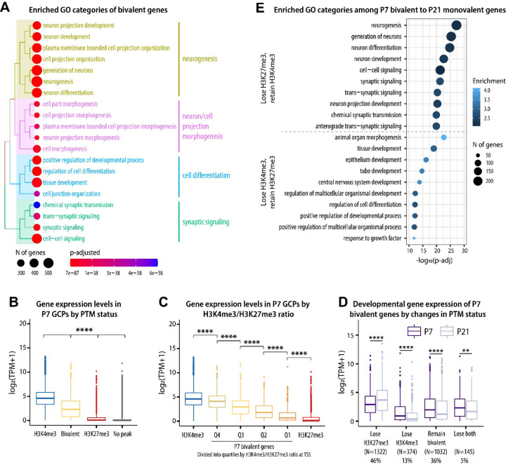 Developing neurons undergo a progression of morphological and gene expression changes as they transition from neuronal progenitors to mature, multipolar neurons. Here we use RNA-seq and H3K4me3 and H3K27me3 ChIP-seq to analyze how chromatin modifications control gene expression in a specific type of CNS neuron, the mouse cerebellar granule cell (GC). We find that in proliferating GC progenitors (GCPs), H3K4me3/H3K27me3 bivalency is common at neuronal genes and undergoes dynamic changes that correlate with gene expression during migration and circuit formation. Expressing a fluorescent sensor for bivalent H3K4me3 and H3K27me3 domains revealed subnuclear bivalent foci in proliferating GCPs. Inhibiting H3K27 methyltransferases EZH1 and EZH2 in vitro and in organotypic cerebellar slices dramatically altered the expression of bivalent genes and induced the downregulation of migration-related genes and upregulation of synaptic genes, inhibited glial-guided migration, and accelerated terminal differentiation. Thus, histone bivalency is required to regulate the timing of the progression from progenitor cells to mature neurons.