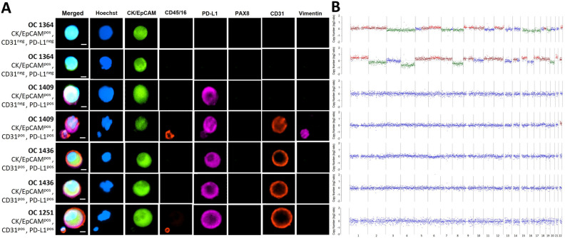 Circulating tumour cells (CTCs) are heterogenous and contain genetic information from the tumour of origin. They bear specific intra- and extra-cellular protein markers aiding in their detection. However, since these markers may be shared with other rare cells in the blood, only genetic testing can confirm their malignancy. Herein, we analyse different CTC subsets using single cell whole genome DNA sequencing to validate their malignant origin. We randomly selected putative CTCs identified by immunostaining that were isolated from 4 patients with high grade serous ovarian cancer (HGSOC) and one with benign cystadenoma. We specifically targeted CTCs positive for epithelial (CK/EpCAMpos), mesenchymal (vimentinpos), and pseudoendothelial (CK/EpCAMpos plus CD31pos) markers. We isolated these cells and performed whole genome amplification (WGA) and low-pass whole-genome sequencing (LP-WGS) for analysis of copy number alterations (CNA). Of the CK/EpCAMpos cells analysed from the HGSOC patients, 2 of 3 cells showed diverse chromosomal CNAs. However, the 4 pseudoendothelial cells (CK/EpCAMpos plus CD31pos) observed in the HGSOC cases did not carry any CNA. Lastly, two of the clusters of vimentin positive cells sequenced from those found in the benign cystadenoma case had CNA. Despite the low number of cells analysed, our results underscore the importance of genetic analysis of putative CTCs to confirm their neoplastic origin. In particular, it highlights the presence of a population of CK/EpCAMpos cells that are not tumour cells in patients with HGSOC, which otherwise would be counted as CTCs.