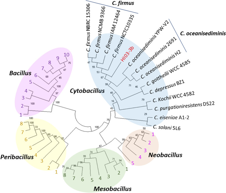 Results: The algal epibiont HI03-3b has a genome of approximately 4,860,704 bp in size with 42.02 mol% G + C content, consisting of 5655 open reading frames (ORFs), 4409 genes coding for proteins (CDSs), 94 genes for tRNAs, and 32 genes for rRNAs. The genome sequence of HI03-3b was most closely related to that of Cytobacillus firmus NCTC10335 with the average amino acid identity (AAI) of 95.0 %, average nucleotide identity (ANI) of 94.1 %, and a recommended DNA-DNA hybridization (DDH) of 57.60 %. These scores are lower than the most frequently used standard for species demarcation (95% ANI cutoff) and the new species threshold (DDH > 70.0% for the same bacterial species). Some differences in genome features and gene composition were observed between HI03-3b and NCTC10335, such as genes encoding carbohydrate active enzymes. These suggest that HI03-3b is unique and likely a novel species within Cytobacillus genus, and we therefore proposed its name as Cytobacillus wakatobiense HI03-3b. Genome sequence analyses indicated the presence of genes involved not only in polysaccharide and protein degradation but also in vitamin and secondary metabolite biosynthesis. Some of them encode enzymes and compounds with biotechnological interest, such as protease, chitinase, subtilisin, pullulanase, and bacillolysin, which are often associated with antimicrobial or antibiofilm activities. This antimicrobial potential is supported by our finding that the extracellular protein fraction of this epibiont inhibited the growth of the bacterial pathogen Staphylococcus aureus.