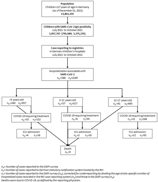 Methods: Comparing risk of COVID-19-related hospitalization, intensive care unit (ICU) admission and death due to COVID-19 in children and adolescents, we used: (1) a multi-center seroprevalence study (SARS-CoV-2-KIDS study); (2) a nationwide registry of pediatric patients hospitalized with SARS-CoV-2 infections; and (3) compulsory national reporting for RT-PCR-confirmed SARS-CoV-2 infections in Germany.