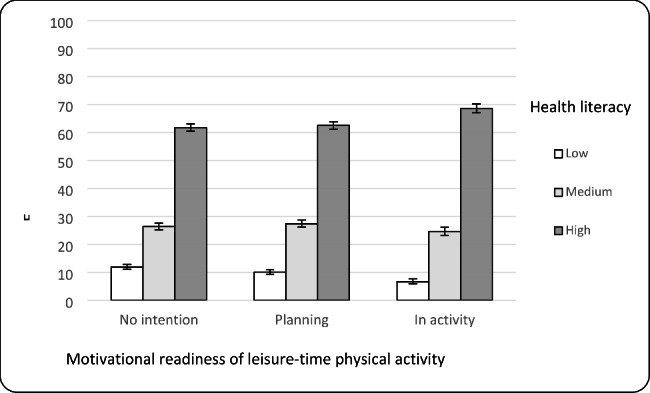 Conclusion: High health literacy was positively associated with more advanced phases of motivational readiness for leisure-time physical activity. Therefore, taking health literacy into account in interventions to promote motivational readiness for leisure-time physical activity could be a useful approach.