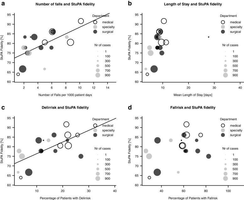 Results: The patient sample had an average age of 68 years and a median length of stay of 8.4 (IQR: 2.1) days. The mean care dependency score was 35.4 points (ePA-AC scale: from 10 points (totally dependent) to 40 points (totally independent)); the mean number of transfers per patient -(e.g., change of room, admission, discharge) was 2.6 (range: 2.4- 2.8). Overall, 336 patients (2.8%) experienced at least one fall, resulting in a rate of 5.1 falls per 1'000 patient days. The median inter-ward StuPA implementation fidelity was 80.6% (range: 63.9-91.7%). We found the mean number of inpatient transfers during hospitalisation and the mean ward-level patient care dependency to be statistically significant predictors of StuPA implementation fidelity.
