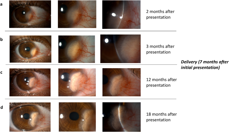 Conclusions and importance: This case illustrates a possible rare manifestation of pregnancy physiology in the cornea. It also emphasizes the utility of close follow-up and conservative management in pregnant patients with idiopathic interstitial keratitis not only to avoid intervention during pregnancy but also because of the possibility of spontaneous improvement or resolution of the corneal changes.