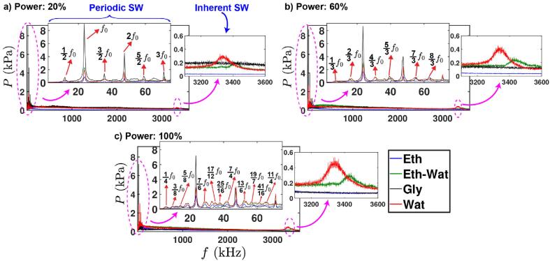 This paper follows our earlier work where a strong high frequency pressure peak has been observed as a consequence of the formation of shock waves due to the collapse of cavitation bubbles in water, excited by an ultrasonic source at 24 kHz. We study here the effects of liquid physical properties on the shock wave characteristics by replacing water as the medium successively with ethanol, glycerol and finally a 1:1 ethanol-water solution. The pressure frequency spectra obtained in our experiments (from more than 1.5 million cavitation collapsing events) show that the expected prominent shockwave pressure peak was barely detected for ethanol and glycerol, particularly at low input powers, but was consistently observed for the 1:1 ethanol-water solution as well as in water, with a slight shift in peak frequency for the solution. We also report two distinct features of shock waves in raising the frequency peak at MHz (inherent) and contributing to the raising of sub-harmonics (periodic). Empirically constructed acoustic pressure maps revealed significantly higher overall pressure amplitudes for the ethanol-water solution than for other liquids. Furthermore, a qualitative analysis revealed that mist-like patterns are developed in ethanol-water solution leading to higher pressures.