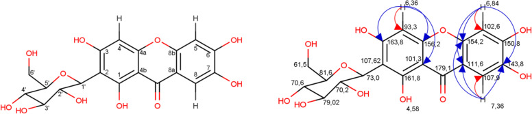 Results: Based on the spectral data, the isolated compounds were determined as 6,4-dihydroxy-4-methoxybenzophenone-2-O-β-D-glucopyranoside (1), 4,4'-dihydroxy-6-methoxybenzophenone-2-O-β-D-glucopyranoside (2) and mangiferin (3). IC50 values of the isolated compounds 1, 2 and 3 were 0.055, 0.07, and 0.025 mM, respectively.