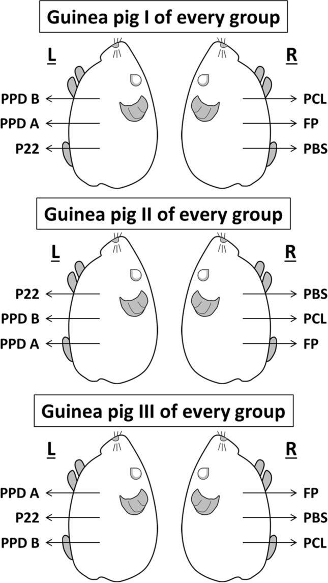 The single and comparative intradermal tuberculin tests (SITT and CITT) are official in vivo tests for bovine tuberculosis (TB) diagnosis using bovine and avian purified protein derivatives (PPD-B and PPD-A). Infection with bacteria other than Mycobacterium tuberculosis complex (MTC) can result in nonspecific reactions to these tests. We evaluated the performance of the skin test with PPDs and new defined antigens in the guinea pig model. A standard dose (SD) of Rhodococcus equi, Nocardia sp., M. nonchromogenicum, M. monacense, M. intracellulare, M. avium subsp. paratuberculosis, M. avium subsp. avium, M. avium subsp. hominissuis, M. scrofulaceum, M. persicum, M. microti, M. caprae and M. bovis, and a higher dose (HD) of M. nonchromogenicum, M. monacense, M. intracellulare, M. avium subsp. paratuberculosis were tested using PPD-B, PPD-A, P22, ESAT-6-CFP-10-Rv3615c peptide cocktail long (PCL) and fusion protein (FP). The SD of R. equi, Nocardia sp., M. nonchromogenicum, M. monacense, M. intracellulare and M. avium subsp. paratuberculosis did not cause any reactions. The HD of M. nonchromogenicum, M. monacense, M. intracellulare, and M. avium subsp. paratuberculosis and the SD of M. avium subsp. hominissuis, M. scrofulaceum and M. persicum, caused nonspecific reactions (SIT). A CITT interpretation would have considered M. avium complex and M. scrofulaceum groups negative, but not all individuals from M. nonchromogenicum HD, M. monacense HD and M. persicum SD groups. Only animals exposed to M. bovis and M. caprae reacted to PCL and FP. These results support the advantage of complementing or replacing PPD-B to improve specificity without losing sensitivity.