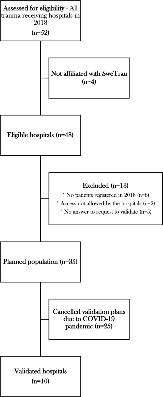 Purpose: Validation of registries is important to ensure accuracy of data and registry-based research. This is often done by comparisons of the original registry data with other sources, e.g. another registry or a re-registration of data. Founded in 2011, the Swedish Trauma Registry (SweTrau) consists of variables based on international consensus (the Utstein Template of Trauma). This project aimed to perform the first validation of SweTrau.