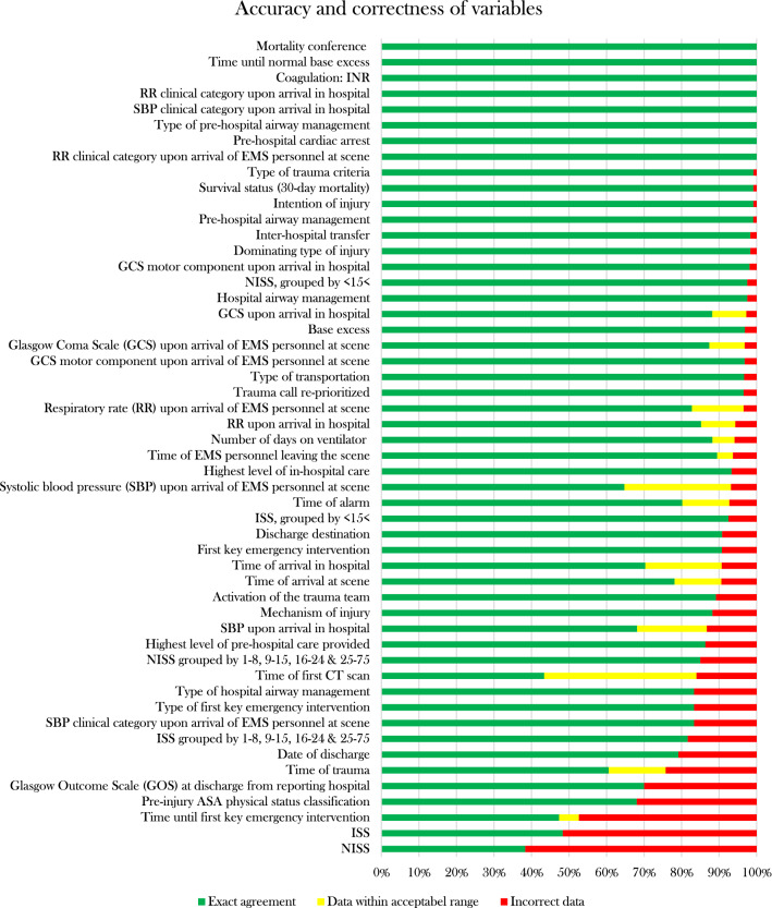 Methods: On-site re-registration was performed on randomly selected trauma patients and compared to the registration in SweTrau. Accuracy (exact agreement), correctness (exact agreement plus data within acceptable range), comparability (similarity with other registries), data completeness (1-missing data) and case completeness (1-missing cases) were deemed as either good ([Formula: see text] 85%), adequate (70-84%) or poor (< 70%). Correlation was determined as either excellent ([Formula: see text] 0.8), strong (0.6-0.79), moderate (0.4-0.59) or weak (< 0.4).