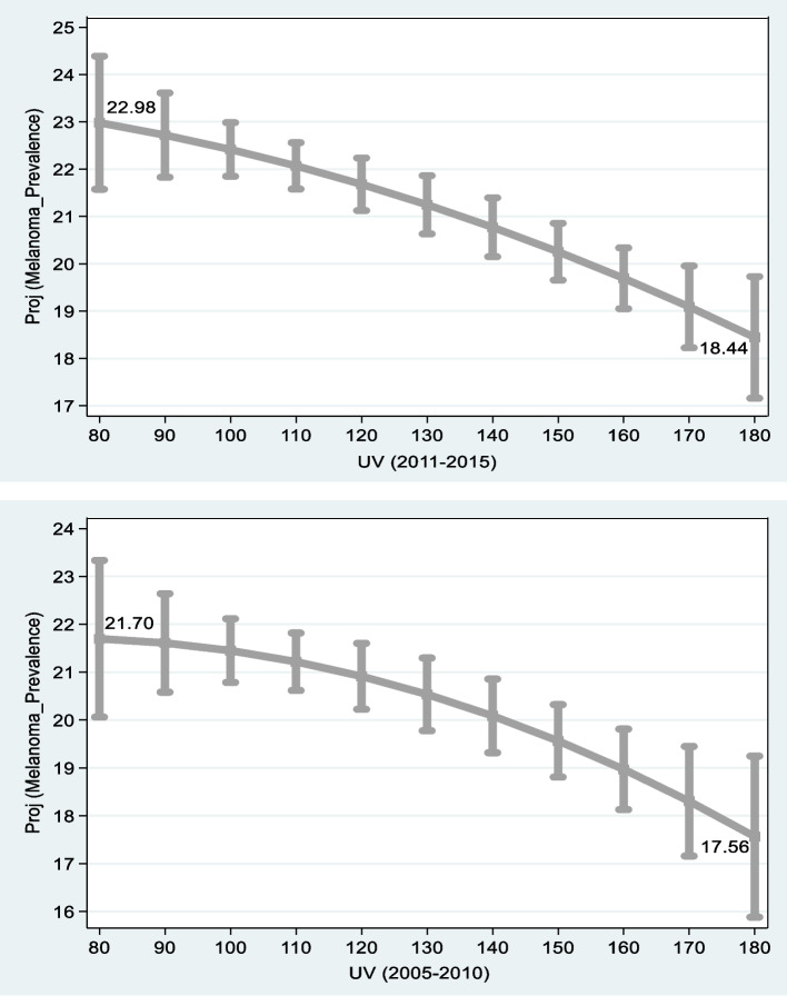 Method: Quadratic regression analysis. This model permits a non-monotonic variation of obesity with new melanoma cases adjusted for age, where the control variable is the level of UV radiation.