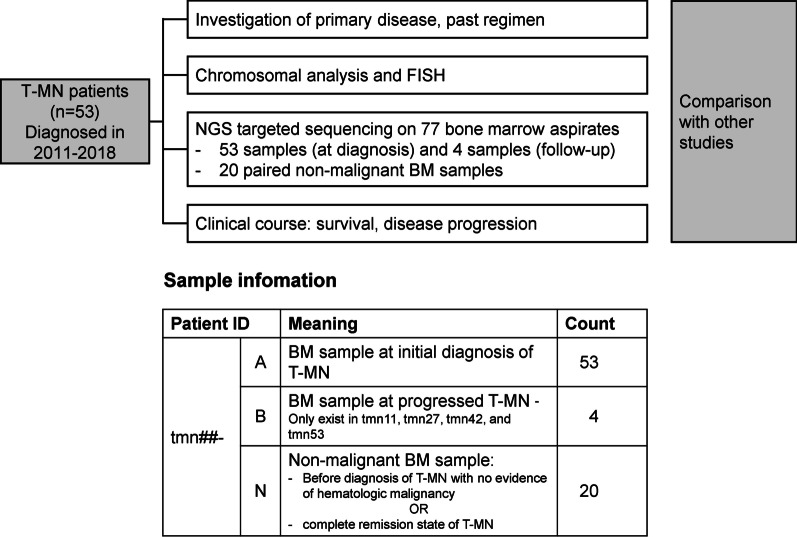 Methods: A review of medical records, cytogenetic study, targeted sequencing by next-generation sequencing, and survival analysis were performed on 53 patients with T-MN at a single institution in Korea.