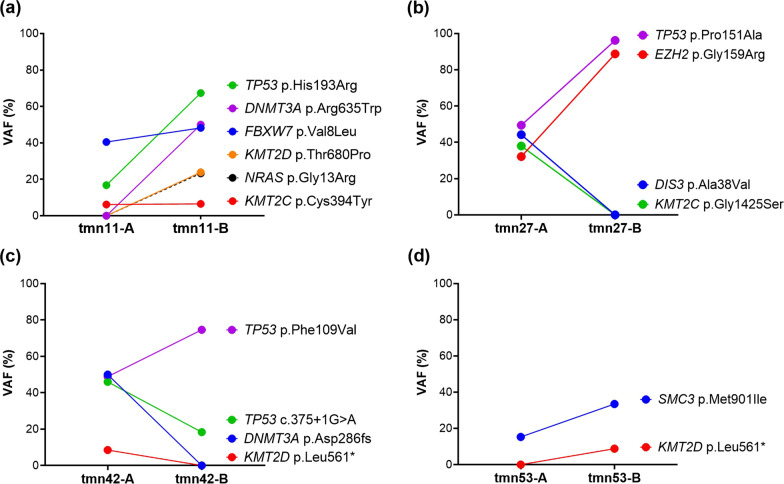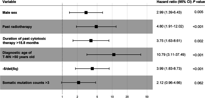Conclusion: The findings of our study corroborate important information about T-MN patients. As well as a considerable predisposition to CPG, the clinical characteristics and somatic variant profile showed distinctive patterns. Germline variant testing should be recommended for T-MN patients. If the T-MN patients harbor pathogenic germline variants, the family members for stem cell donation should be screened for carrier status through germline variant testing to avoid donor-derived myeloid neoplasm. For the prediction of the prognosis in T-MN patients, sex, age, past treatment history, and cytogenetic findings can be considered.