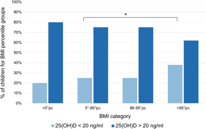 Results: The mean serum 25(OH) D level was 28.2 ng/mL; the prevalence of 25(OH)D sufficiency (> 30 ng/mL), insufficiency (20-30 ng/mL), deficiency (10-20 ng/mL) and severe deficiency (< 10 ng/mL) was 36%, 37%, 21% and 6% of the study-group population, respectively. The lower serum 25(OH)D values were observed during winter (21.6 ng/mL) and spring (22.9 ng/mL), as compared to summer (46.7 ng/mL) (p < 0.001). Higher BMI z-scores were associated with lower 25(OH)D level while no statistical difference was observed as related to gender and age groups.