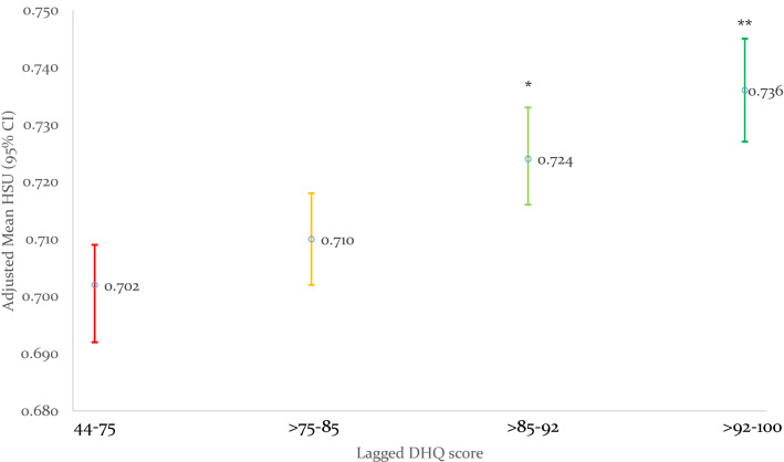 Methods: HSUs were generated from responses to Short-Form Six-Dimension (SF-6D) MAUI, and quality-of-the-diet by Diet Habits Questionnaire (DHQ). Cross-sectional, and short- and long-term prospective associations of DHQ with HSU evaluated by linear regression at 2.5- and 5-years. Pooled prospective associations between DHQ and HSU evaluated using linear and quantile regression. Analyses adjusted for relevant demographic and clinical covariates.