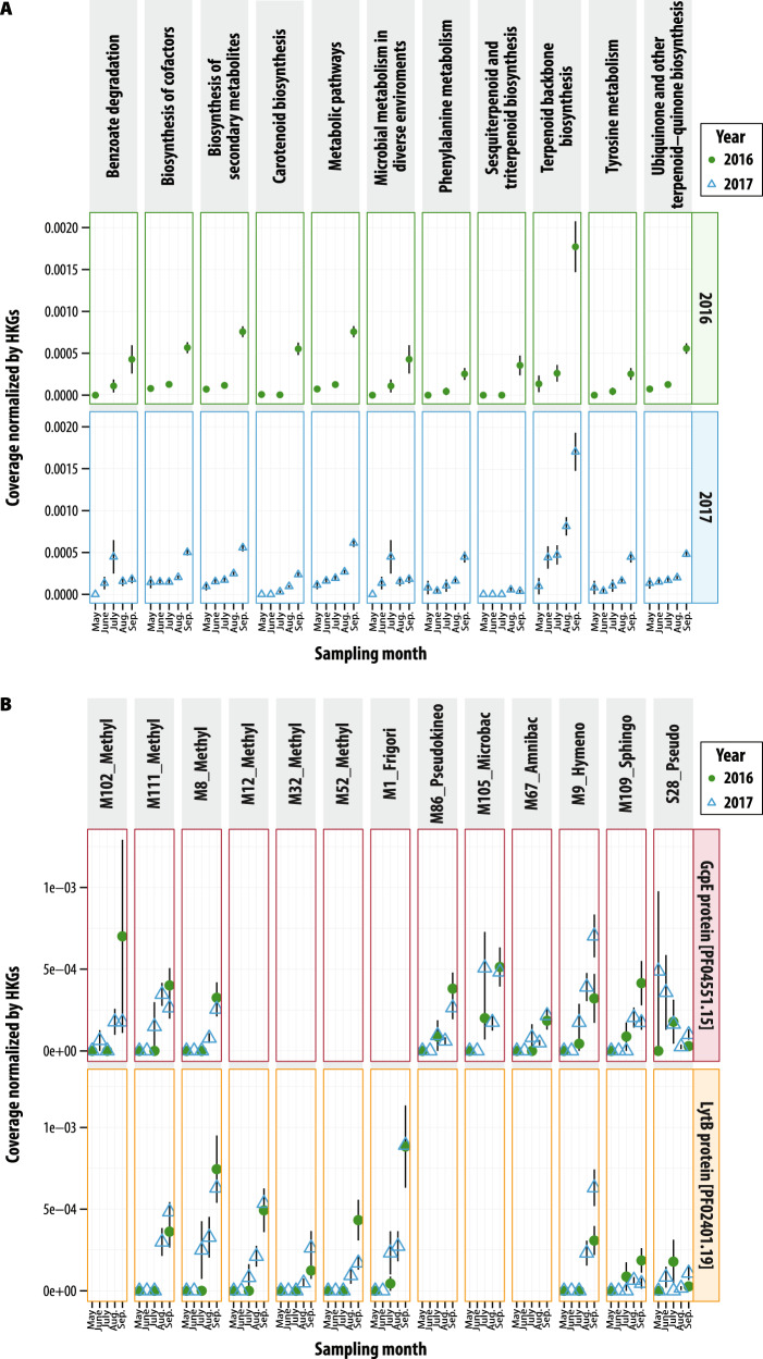 Understanding the interactions between plants and microorganisms can inform microbiome management to enhance crop productivity and resilience to stress. Here, we apply a genome-centric approach to identify ecologically important leaf microbiome members on replicated plots of field-grown switchgrass and miscanthus, and to quantify their activities over two growing seasons for switchgrass. We use metagenome and metatranscriptome sequencing and curate 40 medium- and high-quality metagenome-assembled-genomes (MAGs). We find that classes represented by these MAGs (Actinomycetia, Alpha- and Gamma- Proteobacteria, and Bacteroidota) are active in the late season, and upregulate transcripts for short-chain dehydrogenase, molybdopterin oxidoreductase, and polyketide cyclase. Stress-associated pathways are expressed for most MAGs, suggesting engagement with the host environment. We also detect seasonally activated biosynthetic pathways for terpenes and various non-ribosomal peptide pathways that are poorly annotated. Our findings support that leaf-associated bacterial populations are seasonally dynamic and responsive to host cues.