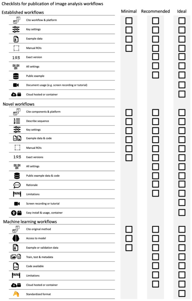 Community-developed checklists for publishing images and image analyses