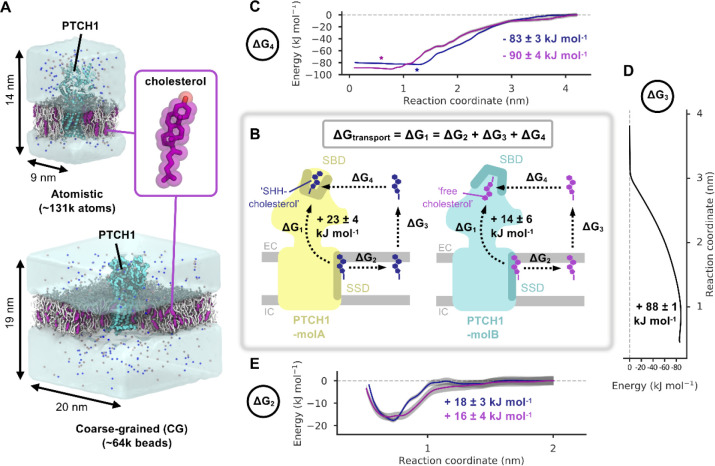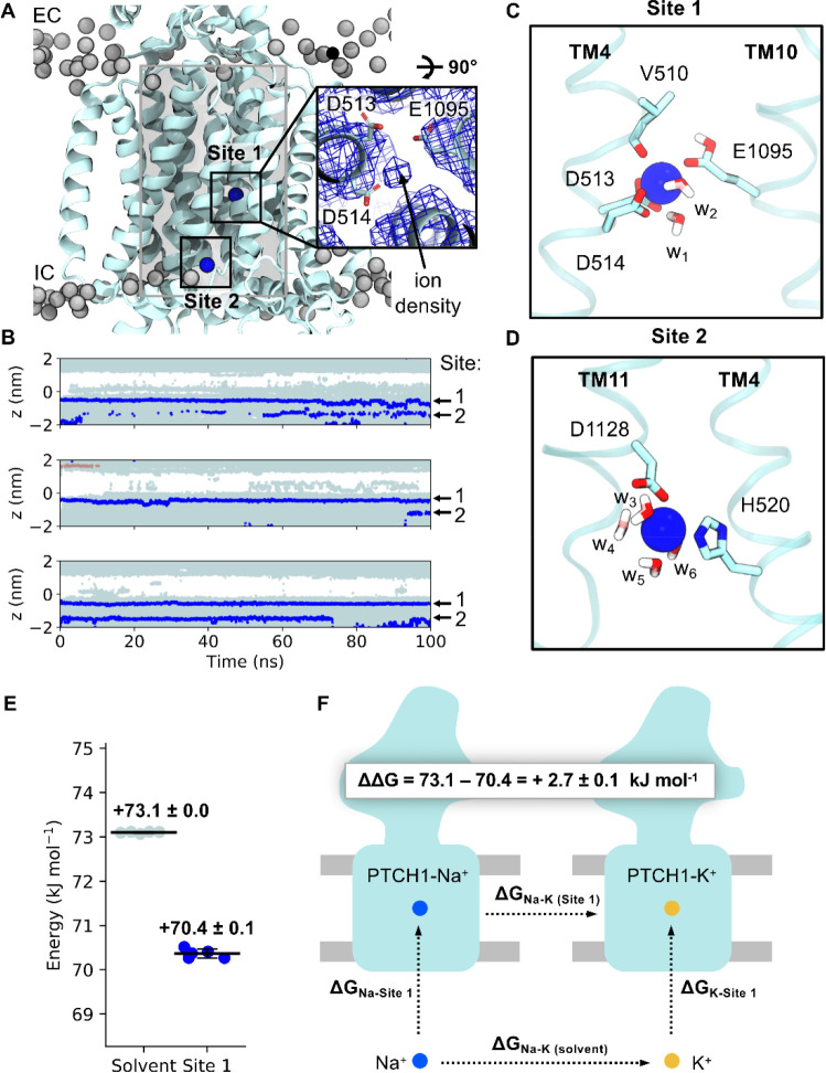 Patched1 (PTCH1) is the principal tumour suppressor protein of the mammalian Hedgehog (HH) signalling pathway, implicated in embryogenesis and tissue homeostasis. PTCH1 inhibits the Class F G protein-coupled receptor Smoothened (SMO) via a debated mechanism involving modulating accessible cholesterol levels within ciliary membranes. Using extensive molecular dynamics (MD) simulations and free energy calculations to evaluate cholesterol transport through PTCH1, we find an energetic barrier of ~15-20 kJ mol -1 for cholesterol export. In simulations we identify cation binding sites within the PTCH1 transmembrane domain (TMD) which may provide the energetic impetus for cholesterol transport. In silico data are coupled to in vivo biochemical assays of PTCH1 mutants to probe coupling between transmembrane motions and PTCH1 activity. Using complementary simulations of Dispatched1 (DISP1) we find that transition between 'inward-open' and solvent 'occluded' states is accompanied by Na + induced pinching of intracellular helical segments. Thus, our findings illuminate the energetics and ion-coupling stoichiometries of PTCH1 transport mechanisms, whereby 1-3 Na + or 2-3 K + couple to cholesterol export, and provide the first molecular description of transitions between distinct transport states.