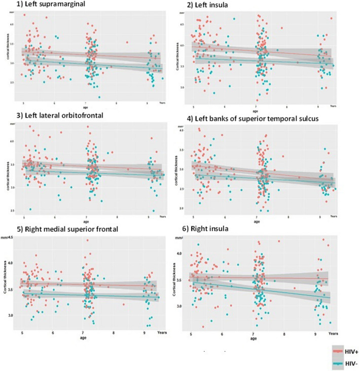 Results: Children without HIV demonstrated generalized cortical thinning from 5 to 9 years, with the rate of thinning varying by region, as well as regional age-related gyrification increases. Overall, the means and developmental trajectories of cortical thickness and gyrification were similar in CPHIV. However, at an uncorrected p < 0.005, 6 regions were identified where the cortex of CPHIV was thicker than in uninfected children, namely bilateral insula, left supramarginal, lateral orbitofrontal and superior temporal, and right medial superior frontal regions. Planned ART interruption did not affect development of cortical morphometry.