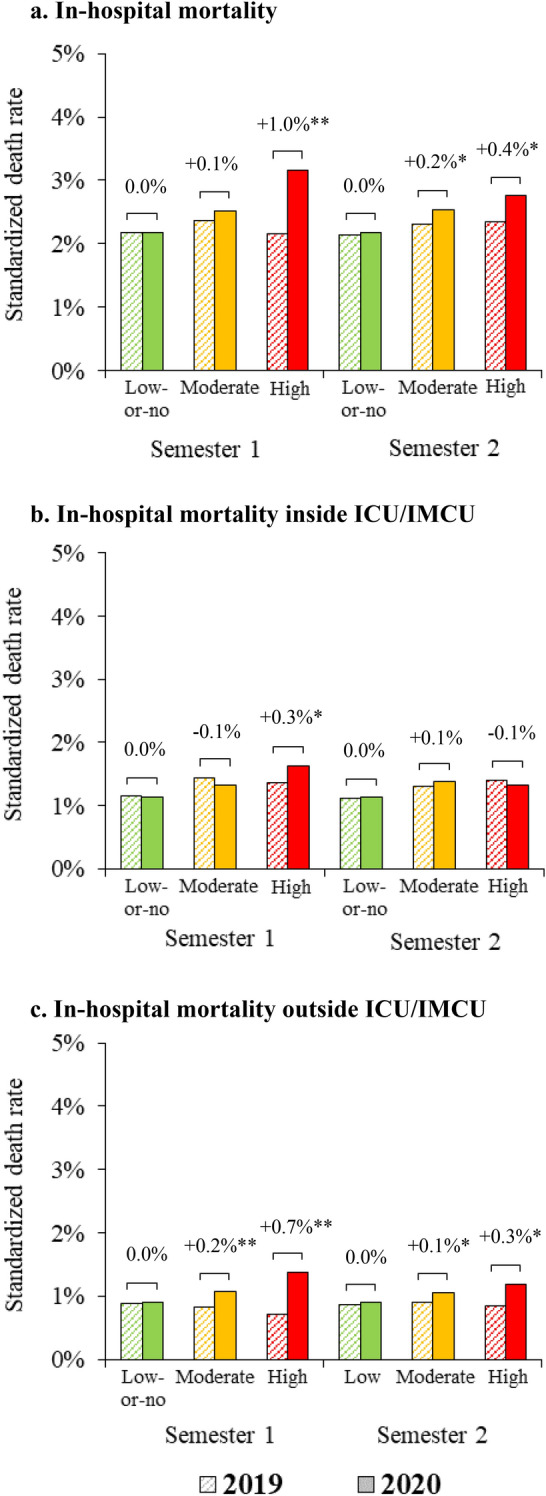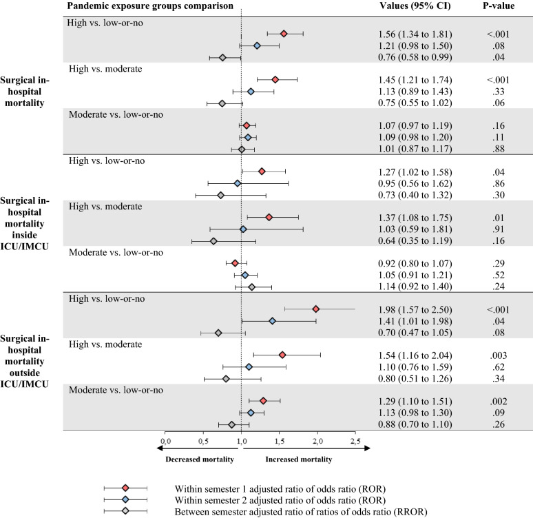 Results: Of 1,870,515 non-COVID-19 patients admitted for surgery in 655 hospitals, 2% died. Compared to 2019, standardized mortality increased by 1% (95% CI 0.6-1.4%) and 0.4% (0-1%) during the first and second semesters of 2020, among patients operated in hospitals highly exposed to pandemic. Compared to the low-or-no exposure group, this corresponded to a higher risk of death during the first semester (adjusted ratio of odds-ratios 1.56, 95% CI 1.34-1.81) both inside (1.27, 1.02-1.58) and outside the ICU/IMCU (1.98, 1.57-2.5), with a significant learning effect during the second semester compared to the first (0.76, 0.58-0.99).