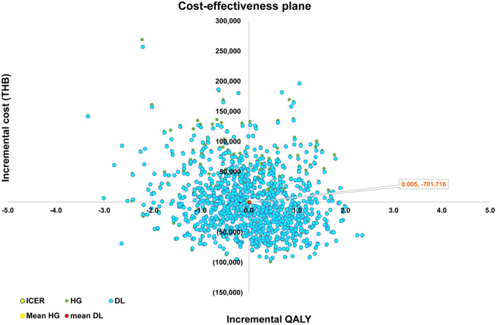 Methods: In the context of a middle-income country (MIC), using Thailand as a model, we constructed a decision tree-Markov hybrid model to estimate lifetime costs and outcomes of Thailand's national DR screening program via DL and trained human graders (HG). We calculated the incremental cost-effectiveness ratio (ICER) between the two strategies. Sensitivity analyses were performed to probe the influence of modeling parameters.