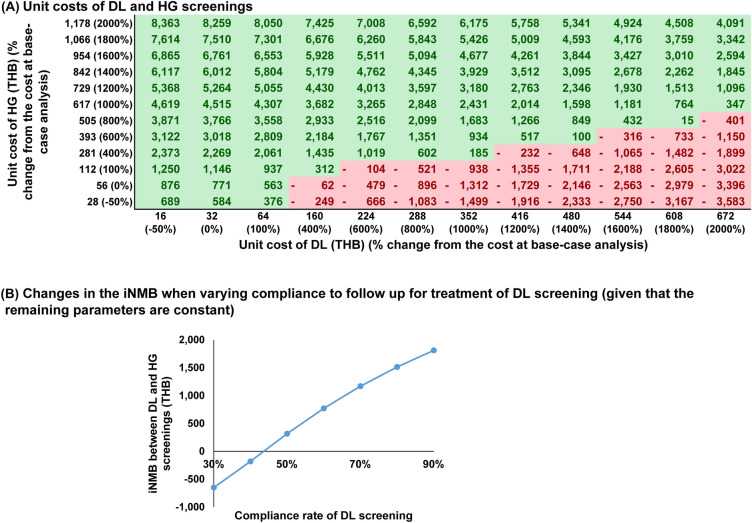 Results: From a societal perspective, screening with DL was associated with a reduction in costs of ~ US$ 2.70, similar quality-adjusted life-years (QALY) of + 0.0043, and an incremental net monetary benefit of ~ US$ 24.10 in the base case. In sensitivity analysis, DL remained cost-effective even with a price increase from US$ 1.00 to US$ 4.00 per patient at a Thai willingness-to-pay threshold of ~ US$ 4.997 per QALY gained. When further incorporating recent findings suggesting improved compliance to treatment referral with DL, our analysis models effectiveness benefits of ~ US$ 20 to US$ 50 depending on compliance.