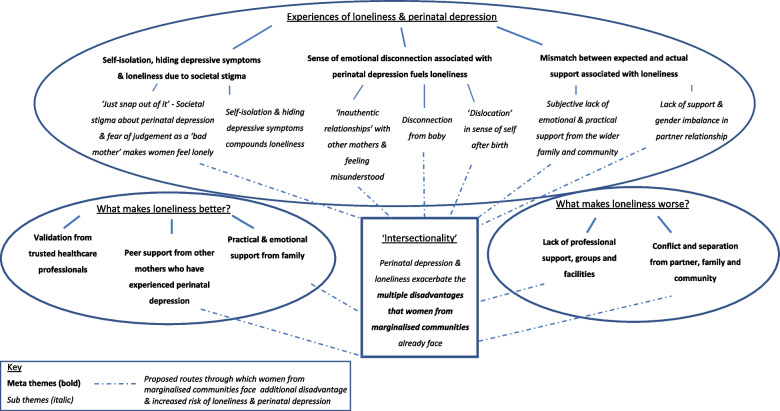 Conclusions: Loneliness appears to play a central role in the experience of perinatal depression based on the frequency with which it emerged in women's accounts. The findings provide a foundation for the development of further theories about the role of loneliness in perinatal depression and evidence in which future psychological and social intervention design processes can be rooted. Addressing stigma and offering culturally appropriate professional and peer support are potential targets for interventions that could help women with perinatal depression, particularly in disadvantaged communities, feel less lonely.