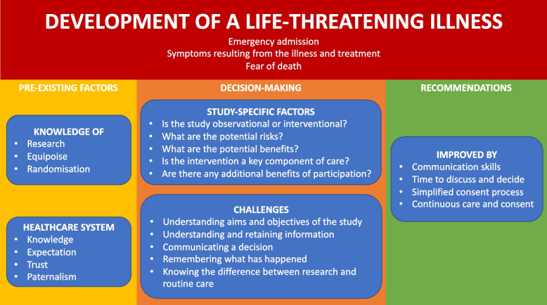 Conclusion: Individuals suffering from a life-threatening illness who are being invited to participate in clinical research need to be managed in a way that adapts to the severity of their illness and there is a need to tailor research processes, including informed consent, accordingly. We provide suggestions for further research and implementation work around research participation for individuals suffering from a life-threatening illness.