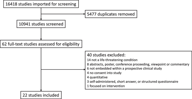 Methods: We conducted a critical interpretive synthesis of qualitative data from trial participants and surrogate decision-makers related to the experience of participating in a clinical research study when suffering from a life-threatening illness. A scoping review informed a systematic review of published data. We searched research databases and reviewed papers for inclusion. Primary data and interpretations of data were extracted from each paper. Data were analysed using reciprocal translational analysis, refutational synthesis, and lines of argument synthesis to develop a synthetic construct.