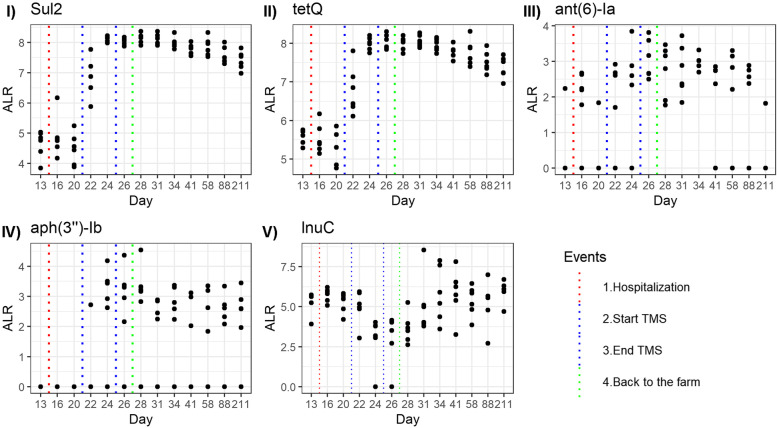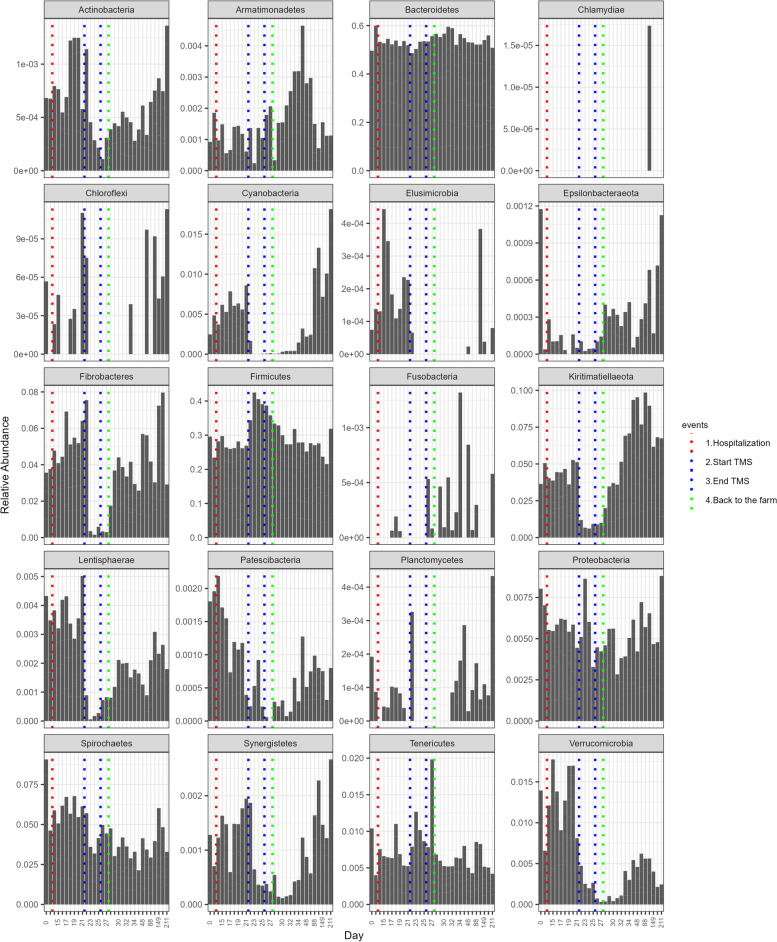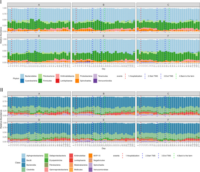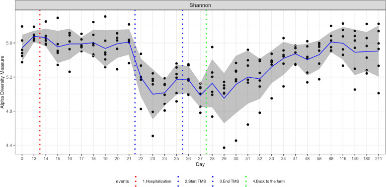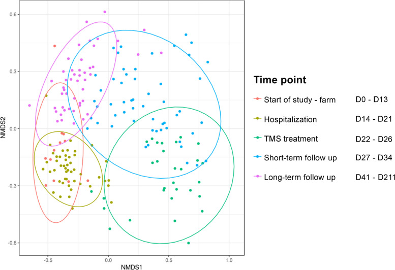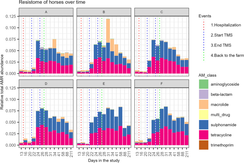 Methods: In a longitudinal experimental study design, in which the ponies served as their own control, faecal samples were collected from six healthy Welsh ponies at the farm (D0-D13-1), immediately following transportation to the hospital (D13-2), during 7 days of hospitalisation without treatment (D14-D21), during 5 days of oral TMS treatment (D22-D26) and after discharge from the hospital up to 6 months later (D27-D211). After DNA extraction, 16S rRNA gene sequencing was performed on all samples. For resistome analysis, shotgun metagenomic sequencing was performed on selected samples.