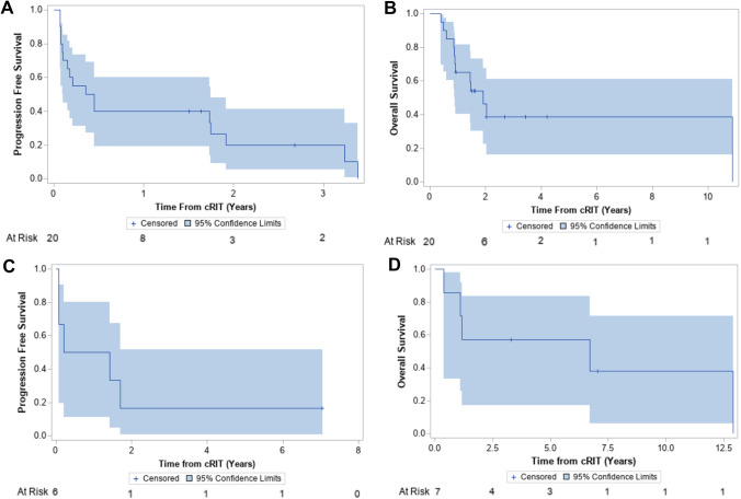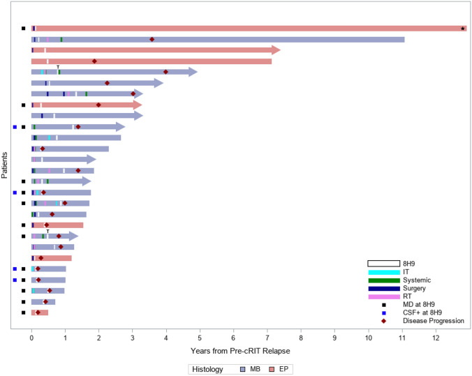 Conclusion: For patients with medulloblastoma, remission at time of cRIT was associated with significantly improved survival outcomes. Relapses are often multifocal, particularly in the setting of measurable disease at cRIT initiation. EBRT is a promising tool to achieve NED status at cRIT initiation, with no cases of radiation necrosis.