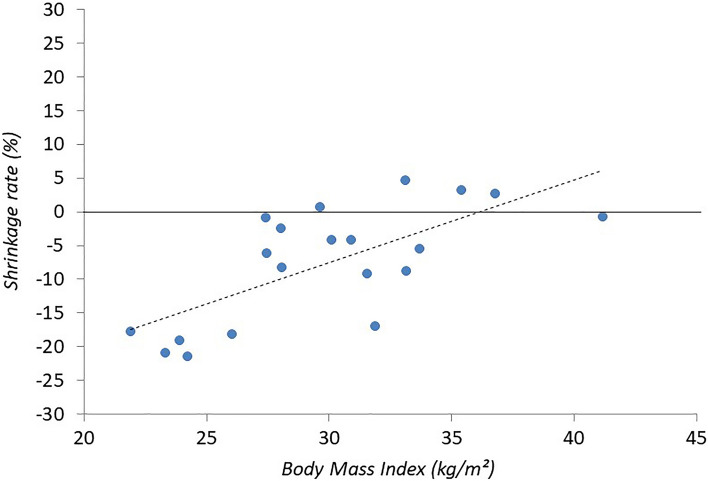 Background: Mesh-reinforced ventral hernia repair is considered the gold standard treatment for all but the smallest of hernias. Human data on mesh shrinkage in the retrorectus mesh position is lacking. A prospective observational cohort study was performed to measure mesh shrinkage in robot-assisted minimal invasive retrorectus repair of ventral hernias.