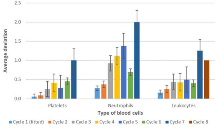 Results: The most common high-grade hematological toxicity was neutropenia [19/28 patients (68%)]. For the FLO(T) regimen, individual grades of thrombocytopenia and leukopenia could be well predicted for cycles 2-4, as well as grades of neutropenia for cycle 2. Prediction accuracy for neutropenia in the third and fourth cycle differed by one toxicity grade on average. For the FOLFIRINOX-regimen, thrombocytopenia predictions showed a maximum deviation of one toxicity grade up to the end of therapy (8 cycles). Deviations of predictions were less than one degree on average up to cycle 4 for neutropenia, and up to cycle 6 for leukopenia.