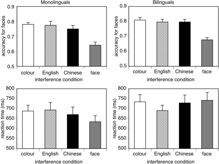 Faces, English words and Chinese characters: a study of dual-task interference in mono-and bilingual speakers