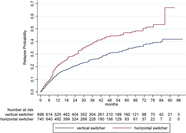 Results: Estimated mean annualized relapse rates (ARR) were 0.39 for horizontal and 0.17 for vertical switchers. The incidence rate ratio (IRR) in the GLM model showed an increased relapse probability of 86% for horizontal versus vertical switchers (IRR = 1.86; 95% CI 1.38-2.50; p < 0.001). Analyzing the time to the first relapse after treatment switch by Cox regression, a hazard ratio of 1.58 (95% CI 1.24-2.02; p < 0.001) indicated an increased risk of 58% for horizontal switchers. The hazard ratios for treatment interruption comparing horizontal versus vertical switchers were 1.78 (95% CI 1.46-2.18; p < 0.001).