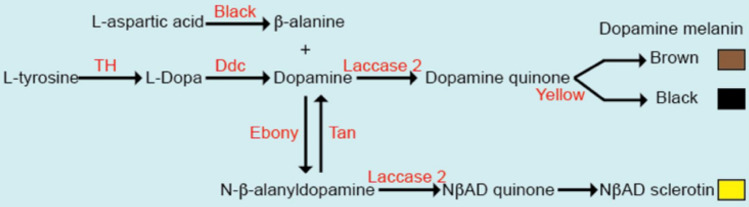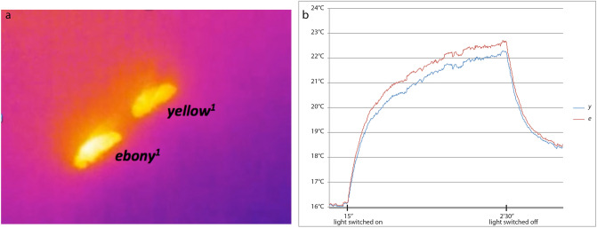Cuticle pigmentation was shown to be associated with body temperature for several relatively large species of insects, but it was questioned for small insects. Here we used a thermal camera to assess the association between drosophilid cuticle pigmentation and body temperature increase when individuals are exposed to light. We compared mutants of large effects within species (Drosophila melanogaster ebony and yellow mutants). Then we analyzed the impact of naturally occurring pigmentation variation within species complexes (Drosophila americana/Drosophila novamexicana and Drosophila yakuba/Drosophila santomea). Finally we analyzed lines of D. melanogaster with moderate differences in pigmentation. We found significant differences in temperatures for each of the four pairs we analyzed. The temperature differences appeared to be proportional to the differently pigmented area: between Drosophila melanogaster ebony and yellow mutants or between Drosophila americana and Drosophila novamexicana, for which the whole body is differently pigmented, the temperature difference was around 0.6 °C ± 0.2 °C. By contrast, between D. yakuba and D. santomea or between Drosophila melanogaster Dark and Pale lines, for which only the posterior abdomen is differentially pigmented, we detected a temperature difference of about 0.14 °C ± 0.10 °C. This strongly suggests that cuticle pigmentation has ecological implications in drosophilids regarding adaptation to environmental temperature.