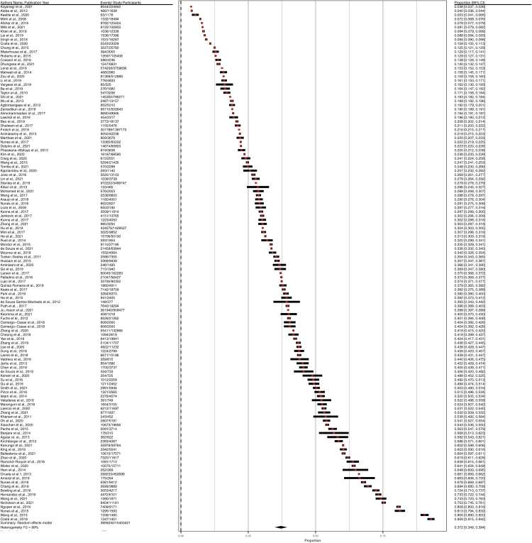 Findings: We analyzed data from 126 peer-reviewed studies that included nearly 15.4 million people (32.1% were male) with a weighted mean age of 56.94 years (standard deviation of 10.84 years) from 54 countries around the world. The overall global prevalence of multimorbidity was 37.2% (95% CI = 34.9-39.4%). South America (45.7%, 95% CI = 39.0-52.5) had the highest prevalence of multimorbidity, followed by North America (43.1%, 95% CI = 32.3-53.8%), Europe (39.2%, 95% CI = 33.2-45.2%), and Asia (35%, 95% CI = 31.4-38.5%). The subgroup study highlights that multimorbidity is more prevalent in females (39.4%, 95% CI = 36.4-42.4%) than males (32.8%, 95% CI = 30.0-35.6%). More than half of the adult population worldwide above 60 years of age had multimorbid conditions (51.0%, 95% CI = 44.1-58.0%). Multimorbidity has become increasingly prevalent in the last two decades, while the prevalence appears to have stayed stable in the recent decade among adults globally.